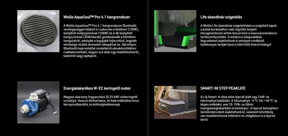 Felszereltségi szintek közötti különbségek: Deluxe kivitel: Alapfelszereltség Premium kivitel: Alapfelszereltség + Világító jetekkel, integrált WIS-sel Premium Plus kivitel: Alapfelszereltség + Világító jetekkel, integrált WIS-sel, hőszivattyú szettel, hőszivattyú tárolós okoslépcsővel