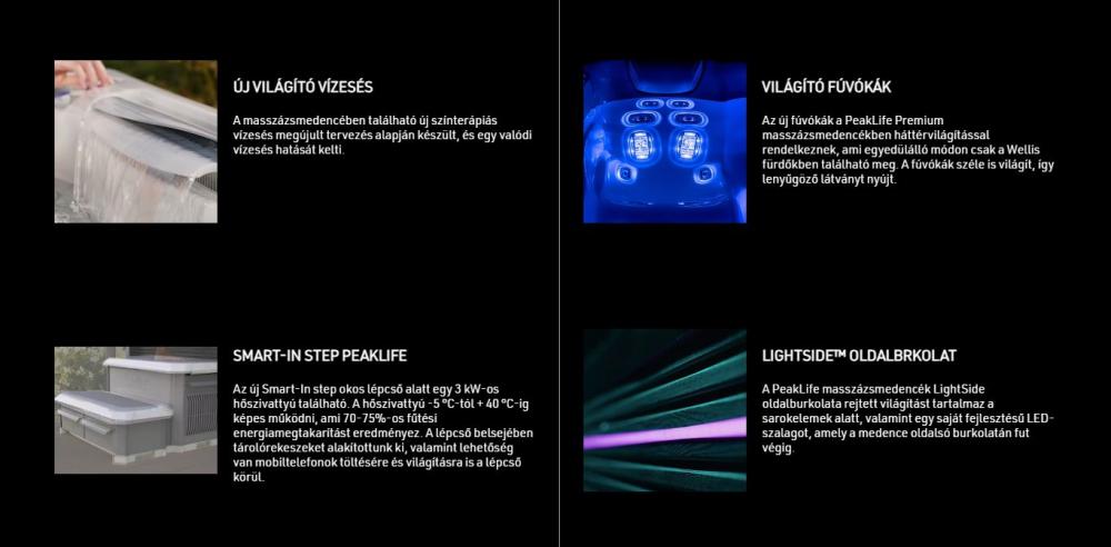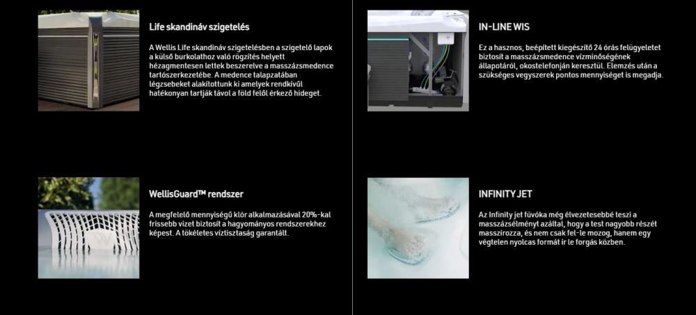 A Wellis Makalu Life jakuzzi akár 5 fő számára is elegendő helyet biztosít, és még kis helyen is kényelmesen elfér. A 2-zone lighting system-nek köszönhetően a központi és peremvilágítás mellett sarokvilágítással is rendelkezik, aminek köszönhetően egyedi látványt nyújt otthonában. A 2,8 kW/h napi fogyasztása kiemelkedő az egész piacon, különösen, mivel egy nagyméretű, 5 férőhelyes jakuzziról van szó.
