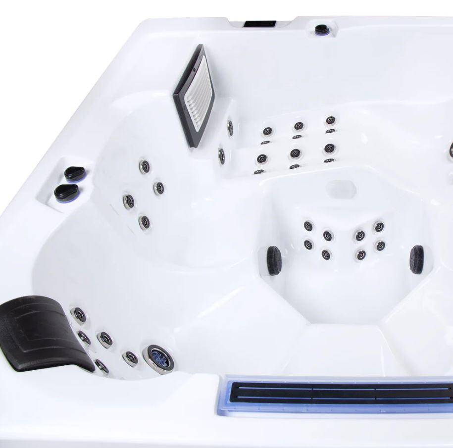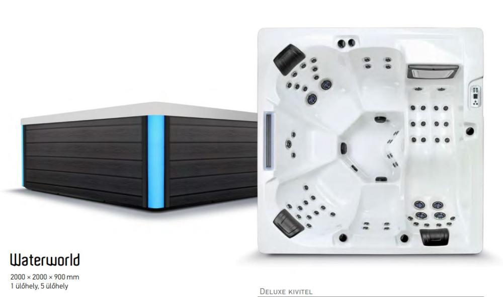 A Waterworld Cinema jakuzzi a kényelem és az innováció tökéletes egyensúlyát kínálja, 1 fekvőhelyet és 5 ülőhelyet tartalmaz. 64 hidroterápiás fúvókával, lenyűgözően megvilágított vízeséssel és olyan fejlett funkciókkal, mint az ARTIC MAX szigetelés és az UV-C vízfertőtlenítés, ez a fürdő kivételes wellness élményt nyújt. A karcsú Arctic White akril dizájn és a szürke HorizontSide™ világítószekrény párosítva időtálló eleganciát biztosít minden környezetben. A MyMusic 2.0 hangrendszerrel és energiahatékony teljesítménnyel kiegészített Waterworld az Ön kapuja a tökéletes kikapcsolódáshoz.